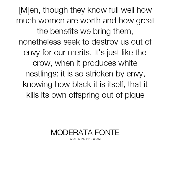 Moderata Fonte quote. [M]en, though they know full well how much women are worth and how great the benefits we bring them, nonetheless seek to destroy us out of envy for our merits. It's just like the crow, when it produces white nestlings: it is so stricken by envy, knowing how black it is itself, that it kills its own offspring out of pique