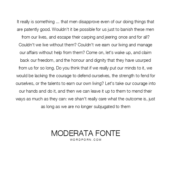 Moderata Fonte quote. It really is something ... that men disapprove even of our doing things that are patently good. Wouldn't it be possible for us just to banish these men from our lives, and escape their carping and jeering once and for all? Couldn't we live without them? Couldn't we earn our living and manage our affairs without help from them? Come on, let's wake up, and claim back our freedom, and the honour and dignity that they have usurped from us for so long. Do you think that if we really put our minds to it, we would be lacking the courage to defend ourselves, the strength to fend for ourselves, or the talents to earn our own living? Let's take our courage into our hands and do it, and then we can leave it up to them to mend their ways as much as they can: we shan't really care what the outcome is, just as long as we are no longer subjugated to them