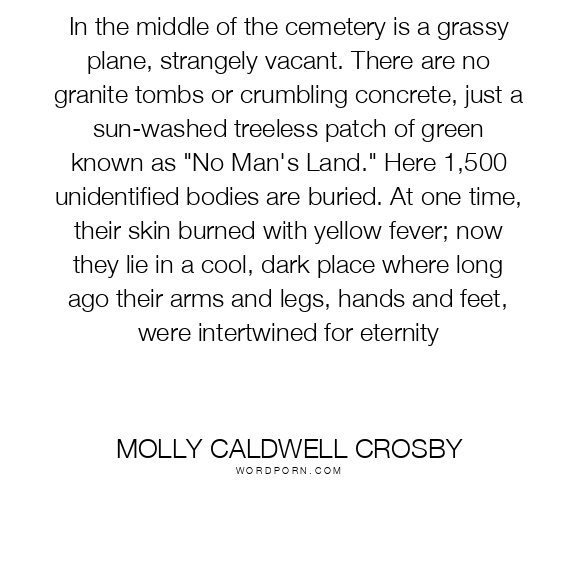 In the middle of the cemetery is a grassy plane, strangely vacant. There are no granite tombs or crumbling concrete, just a sun-washed treeless patch of green known as "No Man's Land." Here 1,500 unidentified bodies are buried. At one time, their skin burned with yellow fever; now they lie in a cool, dark place where long ago their arms and legs, hands and feet, were intertwined for eternity