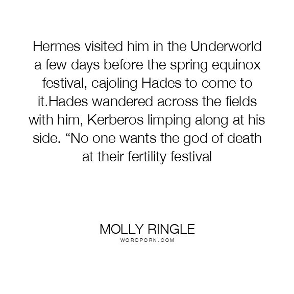 Hermes visited him in the Underworld a few days before the spring equinox festival, cajoling Hades to come to it.Hades wandered across the fields with him, Kerberos limping along at his side. “No one wants the god of death at their fertility festival