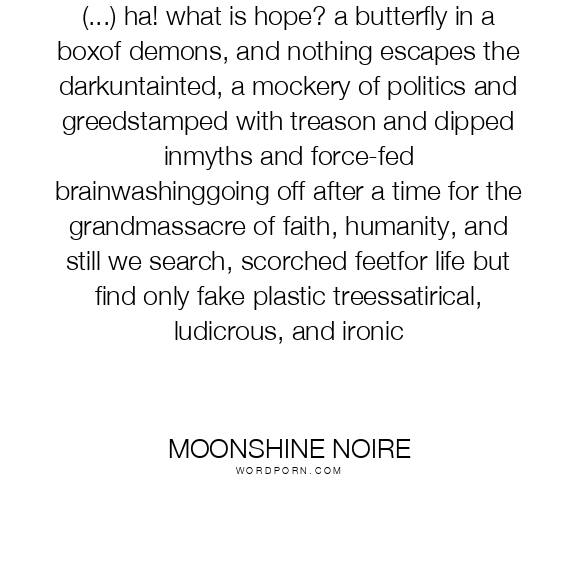 (...) ha! what is hope? a butterfly in a boxof demons, and nothing escapes the darkuntainted, a mockery of politics and greedstamped with treason and dipped inmyths and force-fed brainwashinggoing off after a time for the grandmassacre of faith, humanity, and still we search, scorched feetfor life but find only fake plastic treessatirical, ludicrous, and ironic