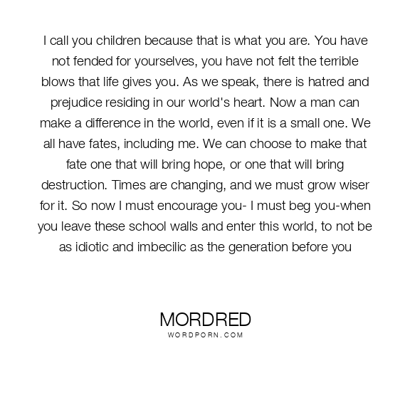I call you children because that is what you are. You have not fended for yourselves, you have not felt the terrible blows that life gives you. As we speak, there is hatred and prejudice residing in our world's heart. Now a man can make a difference in the world, even if it is a small one. We all have fates, including me. We can choose to make that fate one that will bring hope, or one that will bring destruction. Times are changing, and we must grow wiser for it. So now I must encourage you- I must beg you-when you leave these school walls and enter this world, to not be as idiotic and imbecilic as the generation before you
