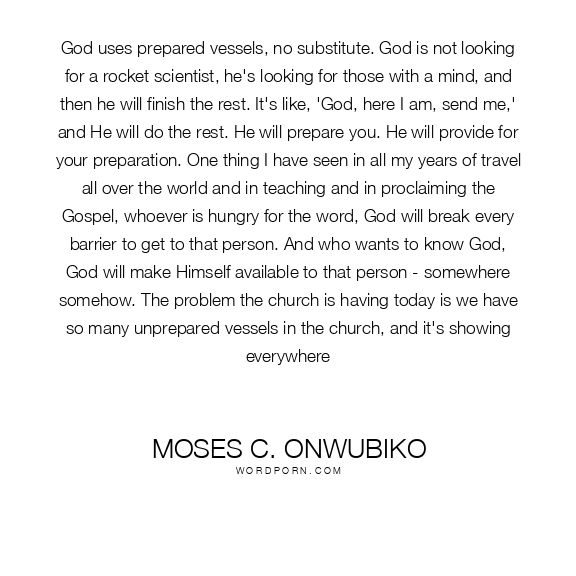 God uses prepared vessels, no substitute. God is not looking for a rocket scientist, he's looking for those with a mind, and then he will finish the rest. It's like, 'God, here I am, send me,' and He will do the rest. He will prepare you. He will provide for your preparation. One thing I have seen in all my years of travel all over the world and in teaching and in proclaiming the Gospel, whoever is hungry for the word, God will break every barrier to get to that person. And who wants to know God, God will make Himself available to that person - somewhere somehow. The problem the church is having today is we have so many unprepared vessels in the church, and it's showing everywhere