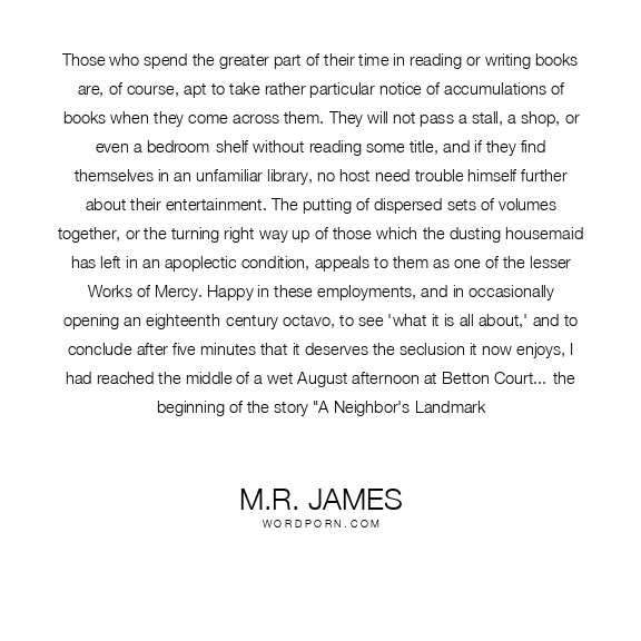 Those who spend the greater part of their time in reading or writing books are, of course, apt to take rather particular notice of accumulations of books when they come across them. They will not pass a stall, a shop, or even a bedroom-shelf without reading some title, and if they find themselves in an unfamiliar library, no host need trouble himself further about their entertainment. The putting of dispersed sets of volumes together, or the turning right way up of those which the dusting housemaid has left in an apoplectic condition, appeals to them as one of the lesser Works of Mercy. Happy in these employments, and in occasionally opening an eighteenth-century octavo, to see 'what it is all about,' and to conclude after five minutes that it deserves the seclusion it now enjoys, I had reached the middle of a wet August afternoon at Betton Court...-the beginning of the story "A Neighbor's Landmark