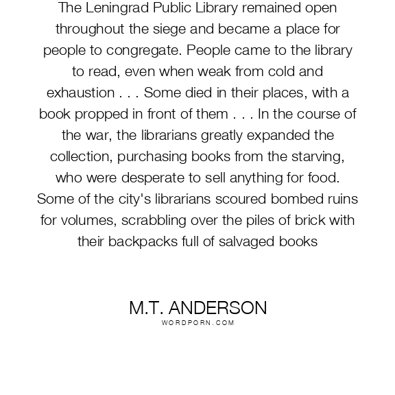 The Leningrad Public Library remained open throughout the siege and became a place for people to congregate. People came to the library to read, even when weak from cold and exhaustion . . . Some died in their places, with a book propped in front of them . . . In the course of the war, the librarians greatly expanded the collection, purchasing books from the starving, who were desperate to sell anything for food. Some of the city's librarians scoured bombed ruins for volumes, scrabbling over the piles of brick with their backpacks full of salvaged books