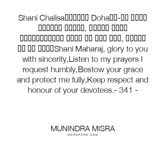 Shani Chalisa॥दोहा॥ Dohaजय-जय श्री शनिदेव प्रभु, सुनहु विनय महराज।करहुं कृपा हे रवि तनय, राखहु जन की लाज॥Shani Maharaj, glory to you with sincerity,Listen to my prayers I request humbly,Bestow your grace and protect me fully,Keep respect and honour of your devotees.- 341 -