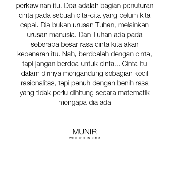 Cinta itu hebat, bahkan lebih hebat dari dunia perkawinan itu. Doa adalah bagian penuturan cinta pada sebuah cita-cita yang belum kita capai. Dia bukan urusan Tuhan, melainkan urusan manusia. Dan Tuhan ada pada seberapa besar rasa cinta kita akan kebenaran itu. Nah, berdoalah dengan cinta, tapi jangan berdoa untuk cinta... Cinta itu dalam dirinya mengandung sebagian kecil rasionalitas, tapi penuh dengan benih rasa yang tidak perlu dihitung secara matematik mengapa dia ada