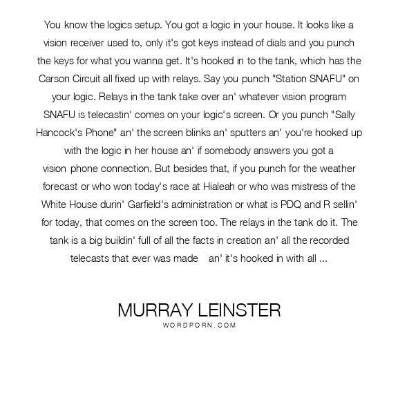 You know the logics setup. You got a logic in your house. It looks like a vision receiver used to, only it's got keys instead of dials and you punch the keys for what you wanna get. It's hooked in to the tank, which has the Carson Circuit all fixed up with relays. Say you punch "Station SNAFU" on your logic. Relays in the tank take over an' whatever vision-program SNAFU is telecastin' comes on your logic's screen. Or you punch "Sally Hancock's Phone" an' the screen blinks an' sputters an' you're hooked up with the logic in her house an' if somebody answers you got a vision-phone connection. But besides that, if you punch for the weather forecast or who won today's race at Hialeah or who was mistress of the White House durin' Garfield's administration or what is PDQ and R sellin' for today, that comes on the screen too. The relays in the tank do it. The tank is a big buildin' full of all the facts in creation an' all the recorded telecasts that ever was made—an' it's hooked in with all the other tanks all over the country—an' everything you wanna know or see or hear, you punch for it an' you get it. Very convenient. Also it does math for you, an' keeps books, an' acts as consultin' chemist, physicist, astronomer, an' tea-leaf reader, with a "Advice to the Lovelorn" thrown in. The only thing it won't do is tell you exactly what your wife meant when she said, "Oh, you think so, do you?" in that peculiar kinda voice. Logics don't work good on women. Only on things that make sense. (1949)