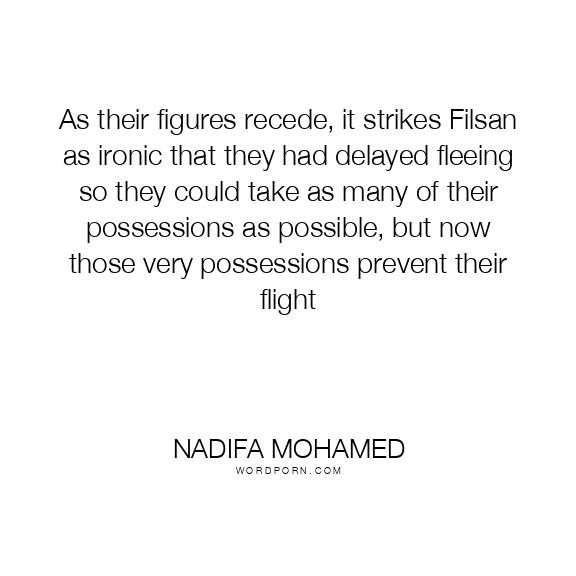 As their figures recede, it strikes Filsan as ironic that they had delayed fleeing so they could take as many of their possessions as possible, but now those very possessions prevent their flight