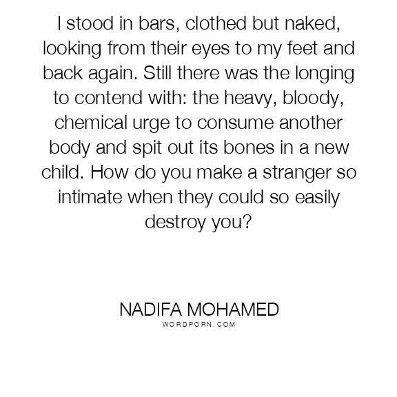 I stood in bars, clothed but naked, looking from their eyes to my feet and back again. Still there was the longing to contend with: the heavy, bloody, chemical urge to consume another body and spit out its bones in a new child. How do you make a stranger so intimate when they could so easily destroy you?