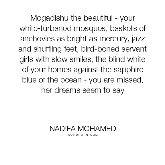 Mogadishu the beautiful - your white-turbaned mosques, baskets of anchovies as bright as mercury, jazz and shuffling feet, bird-boned servant girls with slow smiles, the blind white of your homes against the sapphire blue of the ocean - you are missed, her dreams seem to say