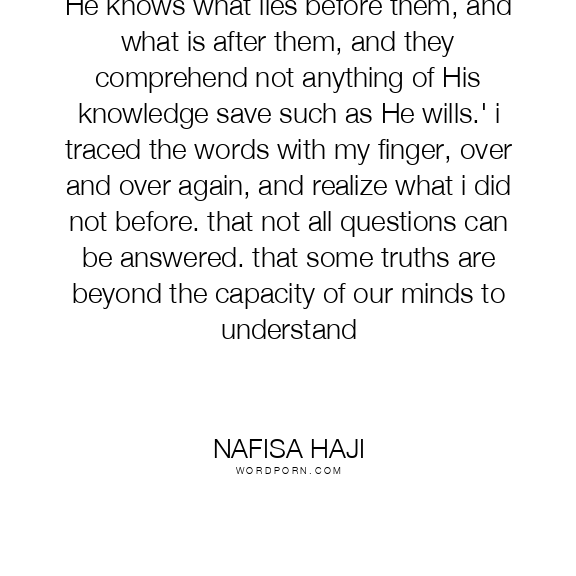 He knows what lies before them, and what is after them, and they comprehend not anything of His knowledge save such as He wills.' i traced the words with my finger, over and over again, and realize what i did not before. that not all questions can be answered. that some truths are beyond the capacity of our minds to understand