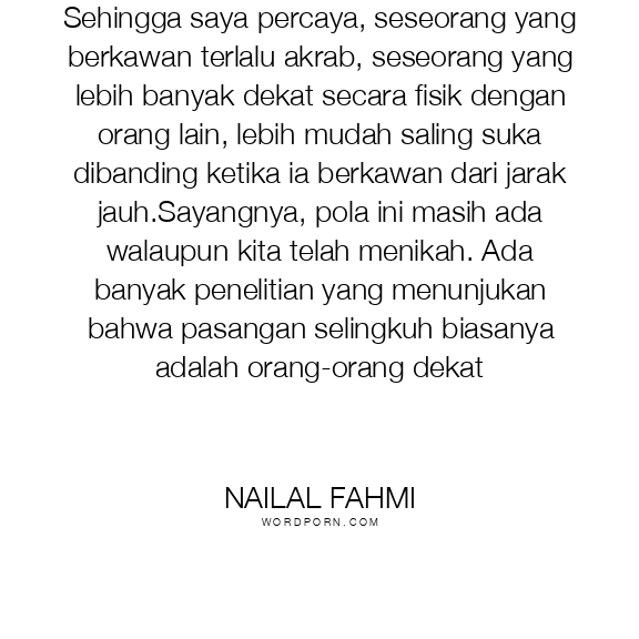 Sehingga saya percaya, seseorang yang berkawan terlalu akrab, seseorang yang lebih banyak dekat secara fisik dengan orang lain, lebih mudah saling suka dibanding ketika ia berkawan dari jarak jauh.Sayangnya, pola ini masih ada walaupun kita telah menikah. Ada banyak penelitian yang menunjukan bahwa pasangan selingkuh biasanya adalah orang-orang dekat