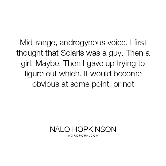 Mid-range, androgynous voice. I first thought that Solaris was a guy. Then a girl. Maybe. Then I gave up trying to figure out which. It would become obvious at some point, or not