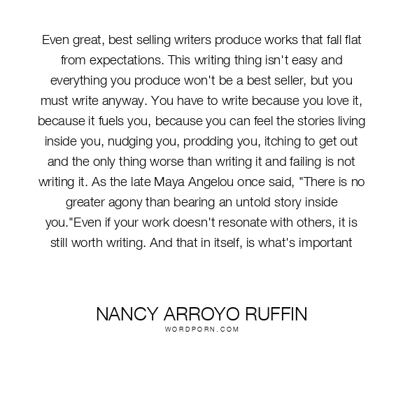 Even great, best selling writers produce works that fall flat from expectations. This writing thing isn't easy and everything you produce won't be a best seller, but you must write anyway. You have to write because you love it, because it fuels you, because you can feel the stories living inside you, nudging you, prodding you, itching to get out and the only thing worse than writing it and failing is not writing it. As the late Maya Angelou once said, "There is no greater agony than bearing an untold story inside you."Even if your work doesn't resonate with others, it is still worth writing. And that in itself, is what's important