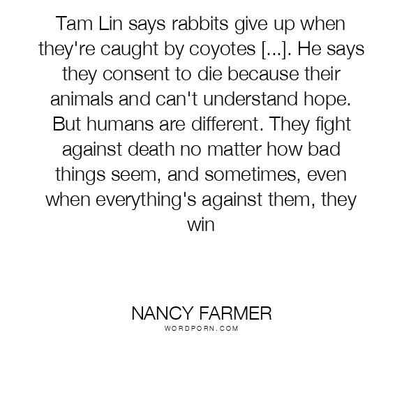 Tam Lin says rabbits give up when they're caught by coyotes [...]. He says they consent to die because their animals and can't understand hope. But humans are different. They fight against death no matter how bad things seem, and sometimes, even when everything's against them, they win