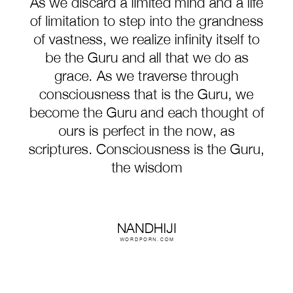 As we discard a limited mind and a life of limitation to step into the grandness of vastness, we realize infinity itself to be the Guru and all that we do as grace. As we traverse through consciousness that is the Guru, we become the Guru and each thought of ours is perfect in the now, as scriptures. Consciousness is the Guru, the wisdom
