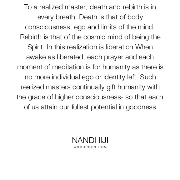 To a realized master, death and rebirth is in every breath. Death is that of body consciousness, ego and limits of the mind. Rebirth is that of the cosmic mind of being the Spirit. In this realization is liberation.When awake as liberated, each prayer and each moment of meditation is for humanity as there is no more individual ego or identity left. Such realized masters continually gift humanity with the grace of higher consciousness- so that each of us attain our fullest potential in goodness