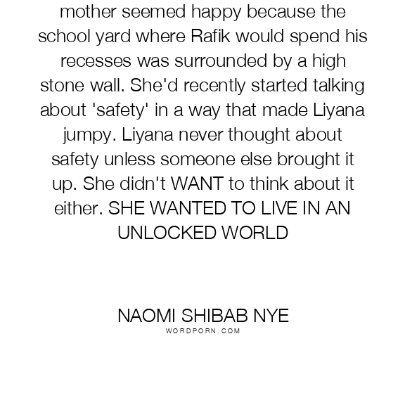 mother seemed happy because the school yard where Rafik would spend his recesses was surrounded by a high stone wall. She'd recently started talking about 'safety' in a way that made Liyana jumpy. Liyana never thought about safety unless someone else brought it up. She didn't WANT to think about it either. SHE WANTED TO LIVE IN AN UNLOCKED WORLD