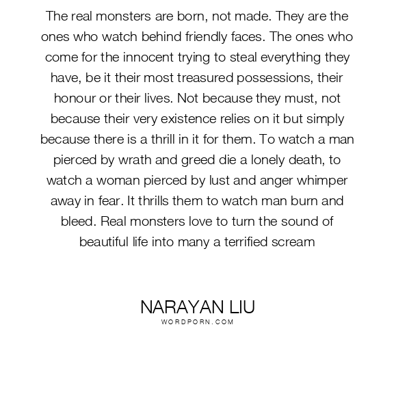 The real monsters are born, not made. They are the ones who watch behind friendly faces. The ones who come for the innocent trying to steal everything they have, be it their most treasured possessions, their honour or their lives. Not because they must, not because their very existence relies on it but simply because there is a thrill in it for them. To watch a man pierced by wrath and greed die a lonely death, to watch a woman pierced by lust and anger whimper away in fear. It thrills them to watch man burn and bleed. Real monsters love to turn the sound of beautiful life into many a terrified scream