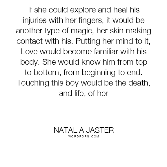 If she could explore and heal his injuries with her fingers, it would be another type of magic, her skin making contact with his. Putting her mind to it, Love would become familiar with his body. She would know him from top to bottom, from beginning to end. Touching this boy would be the death, and life, of her