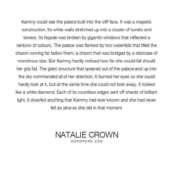 Kammy could see the palace built into the cliff face. It was a majestic construction. Its white walls stretched up into a cluster of turrets and towers. Its façade was broken by gigantic windows that reflected a rainbow of colours. The palace was flanked by two waterfalls that filled the chasm running far below them; a chasm that was bridged by a staircase of monstrous size. But Kammy hardly noticed how far she would fall should her grip fail. The giant structure that speared out of the palace and up into the sky commanded all of her attention. It burned her eyes so she could hardly look at it, but at the same time she could not look away. It looked like a white diamond. Each of its countless edges sent off shards of brilliant light. It dwarfed anything that Kammy had ever known and she had never felt as alive as she did in that moment