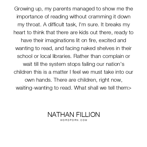 Growing up, my parents managed to show me the importance of reading without cramming it down my throat. A difficult task, I'm sure. It breaks my heart to think that there are kids out there, ready to have their imaginations lit on fire, excited and wanting to read, and facing naked shelves in their school or local libraries. Rather than complain or wait till the system stops failing our nation's children this is a matter I feel we must take into our own hands. There are children, right now, waiting-wanting to read. What shall we tell them>