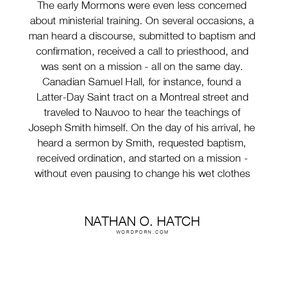 The early Mormons were even less concerned about ministerial training. On several occasions, a man heard a discourse, submitted to baptism and confirmation, received a call to priesthood, and was sent on a mission - all on the same day. Canadian Samuel Hall, for instance, found a Latter-Day Saint tract on a Montreal street and traveled to Nauvoo to hear the teachings of Joseph Smith himself. On the day of his arrival, he heard a sermon by Smith, requested baptism, received ordination, and started on a mission - without even pausing to change his wet clothes