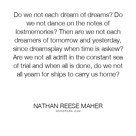 Do we not each dream of dreams? Do we not dance on the notes of lostmemories? Then are we not each dreamers of tomorrow and yesterday, since dreamsplay when time is askew? Are we not all adrift in the constant sea of trial and when all is done, do we not all yearn for ships to carry us home?