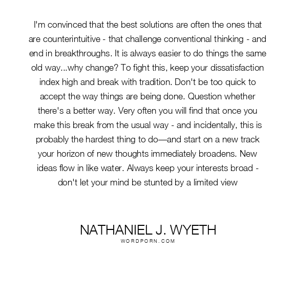 I'm convinced that the best solutions are often the ones that are counterintuitive - that challenge conventional thinking - and end in breakthroughs. It is always easier to do things the same old way...why change? To fight this, keep your dissatisfaction index high and break with tradition. Don't be too quick to accept the way things are being done. Question whether there's a better way. Very often you will find that once you make this break from the usual way - and incidentally, this is probably the hardest thing to do—and start on a new track your horizon of new thoughts immediately broadens. New ideas flow in like water. Always keep your interests broad - don't let your mind be stunted by a limited view