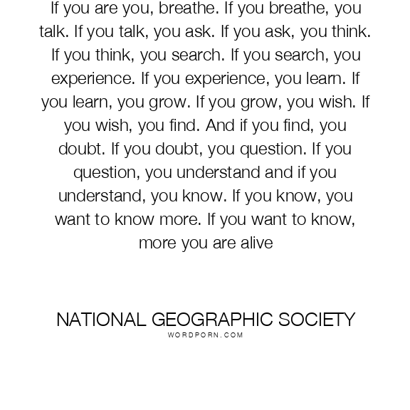 If you are you, breathe. If you breathe, you talk. If you talk, you ask. If you ask, you think. If you think, you search. If you search, you experience. If you experience, you learn. If you learn, you grow. If you grow, you wish. If you wish, you find. And if you find, you doubt. If you doubt, you question. If you question, you understand and if you understand, you know. If you know, you want to know more. If you want to know, more you are alive