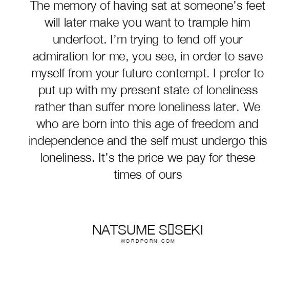 The memory of having sat at someone’s feet will later make you want to trample him underfoot. I’m trying to fend off your admiration for me, you see, in order to save myself from your future contempt. I prefer to put up with my present state of loneliness rather than suffer more loneliness later. We who are born into this age of freedom and independence and the self must undergo this loneliness. It’s the price we pay for these times of ours