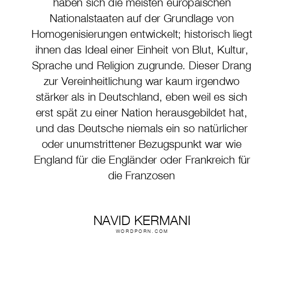 Anders als die Vereinigten Staaten von Amerika haben sich die meisten europäischen Nationalstaaten auf der Grundlage von Homogenisierungen entwickelt; historisch liegt ihnen das Ideal einer Einheit von Blut, Kultur, Sprache und Religion zugrunde. Dieser Drang zur Vereinheitlichung war kaum irgendwo stärker als in Deutschland, eben weil es sich erst spät zu einer Nation herausgebildet hat, und das Deutsche niemals ein so natürlicher oder unumstrittener Bezugspunkt war wie England für die Engländer oder Frankreich für die Franzosen
