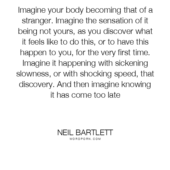Imagine your body becoming that of a stranger. Imagine the sensation of it being not yours, as you discover what it feels like to do this, or to have this happen to you, for the very first time. Imagine it happening with sickening slowness, or with shocking speed, that discovery. And then imagine knowing it has come too late