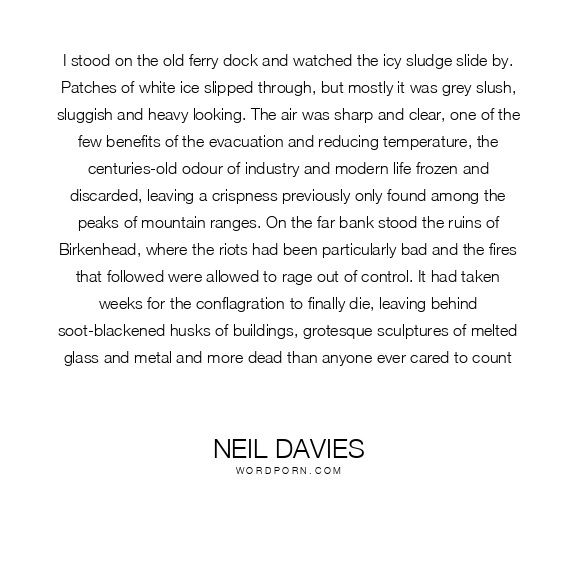 I stood on the old ferry dock and watched the icy sludge slide by. Patches of white ice slipped through, but mostly it was grey slush, sluggish and heavy looking. The air was sharp and clear, one of the few benefits of the evacuation and reducing temperature, the centuries-old odour of industry and modern life frozen and discarded, leaving a crispness previously only found among the peaks of mountain ranges. On the far bank stood the ruins of Birkenhead, where the riots had been particularly bad and the fires that followed were allowed to rage out of control. It had taken weeks for the conflagration to finally die, leaving behind soot-blackened husks of buildings, grotesque sculptures of melted glass and metal and more dead than anyone ever cared to count