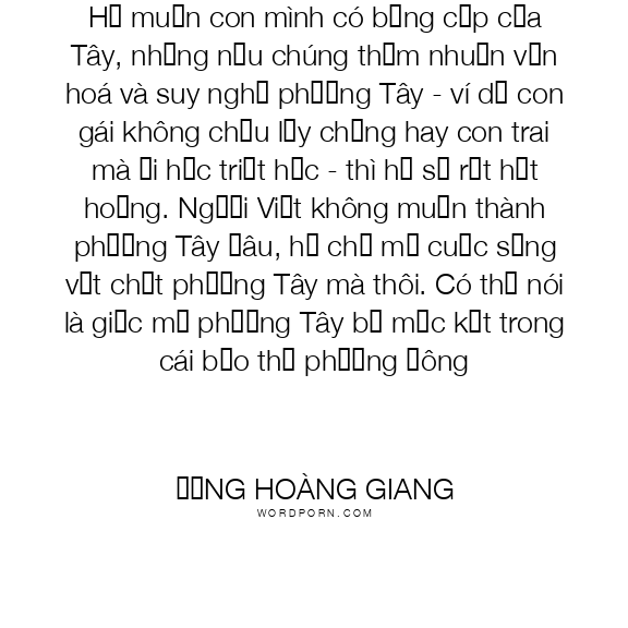 Họ muốn con mình có bằng cấp của Tây, nhưng nếu chúng thấm nhuần văn hoá và suy nghĩ phương Tây - ví dụ con gái không chịu lấy chồng hay con trai mà đi học triết học - thì họ sẽ rất hốt hoảng. Người Việt không muốn thành phương Tây đâu, họ chỉ mơ cuộc sống vật chất phương Tây mà thôi. Có thể nói là giấc mơ phương Tây bị mắc kẹt trong cái bảo thủ phương Đông
