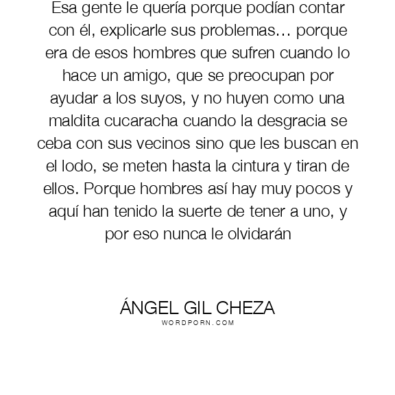 Esa gente le quería porque podían contar con él, explicarle sus problemas… porque era de esos hombres que sufren cuando lo hace un amigo, que se preocupan por ayudar a los suyos, y no huyen como una maldita cucaracha cuando la desgracia se ceba con sus vecinos sino que les buscan en el lodo, se meten hasta la cintura y tiran de ellos. Porque hombres así hay muy pocos y aquí han tenido la suerte de tener a uno, y por eso nunca le olvidarán