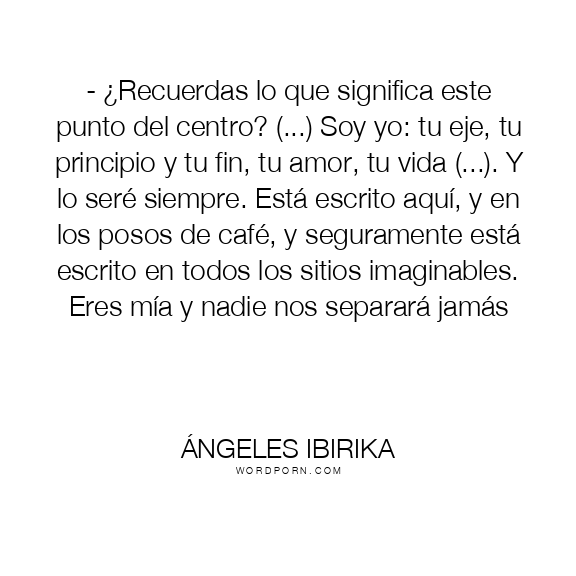 - ¿Recuerdas lo que significa este punto del centro? (...) Soy yo: tu eje, tu principio y tu fin, tu amor, tu vida (...). Y lo seré siempre. Está escrito aquí, y en los posos de café, y seguramente está escrito en todos los sitios imaginables. Eres mía y nadie nos separará jamás