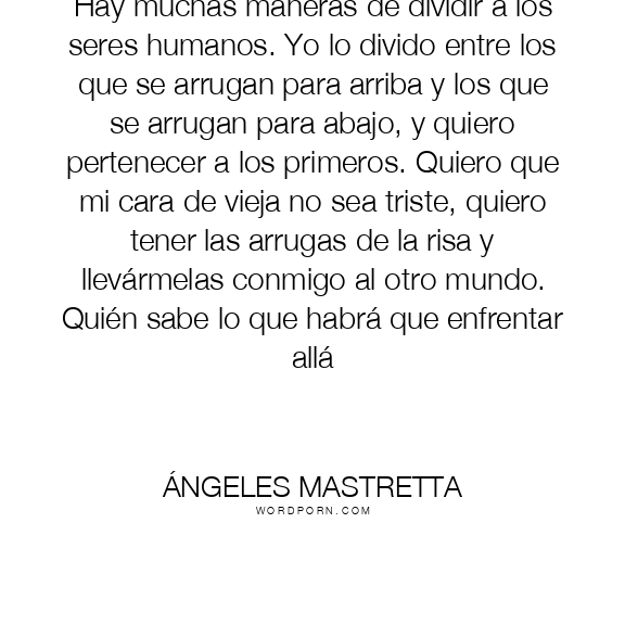 Hay muchas maneras de dividir a los seres humanos. Yo lo divido entre los que se arrugan para arriba y los que se arrugan para abajo, y quiero pertenecer a los primeros. Quiero que mi cara de vieja no sea triste, quiero tener las arrugas de la risa y llevármelas conmigo al otro mundo. Quién sabe lo que habrá que enfrentar allá