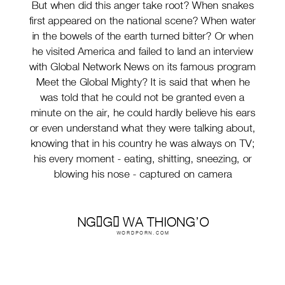 But when did this anger take root? When snakes first appeared on the national scene? When water in the bowels of the earth turned bitter? Or when he visited America and failed to land an interview with Global Network News on its famous program Meet the Global Mighty? It is said that when he was told that he could not be granted even a minute on the air, he could hardly believe his ears or even understand what they were talking about, knowing that in his country he was always on TV; his every moment - eating, shitting, sneezing, or blowing his nose - captured on camera