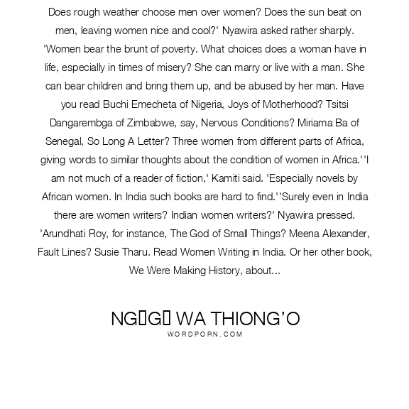 Does rough weather choose men over women? Does the sun beat on men, leaving women nice and cool?' Nyawira asked rather sharply. 'Women bear the brunt of poverty. What choices does a woman have in life, especially in times of misery? She can marry or live with a man. She can bear children and bring them up, and be abused by her man. Have you read Buchi Emecheta of Nigeria, Joys of Motherhood? Tsitsi Dangarembga of Zimbabwe, say, Nervous Conditions? Miriama Ba of Senegal, So Long A Letter? Three women from different parts of Africa, giving words to similar thoughts about the condition of women in Africa.''I am not much of a reader of fiction,' Kamiti said. 'Especially novels by African women. In India such books are hard to find.''Surely even in India there are women writers? Indian women writers?' Nyawira pressed. 'Arundhati Roy, for instance, The God of Small Things? Meena Alexander, Fault Lines? Susie Tharu. Read Women Writing in India. Or her other book, We Were Making History, about women in the struggle!''I have sampled the epics of Indian literature,' Kamiti said, trying to redeem himself. 'Mahabharata, Ramayana, and mostly Bhagavad Gita. There are a few others, what they call Purana, Rig-Veda, Upanishads … Not that I read everything, but …''I am sure that those epics and Puranas, even the Gita, were all written by men,' Nyawira said. 'The same men who invented the caste system. When will you learn to listen to the voices of women?