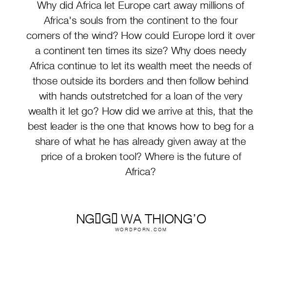 Why did Africa let Europe cart away millions of Africa's souls from the continent to the four corners of the wind? How could Europe lord it over a continent ten times its size? Why does needy Africa continue to let its wealth meet the needs of those outside its borders and then follow behind with hands outstretched for a loan of the very wealth it let go? How did we arrive at this, that the best leader is the one that knows how to beg for a share of what he has already given away at the price of a broken tool? Where is the future of Africa?