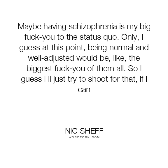 Maybe having schizophrenia is my big fuck-you to the status quo. Only, I guess at this point, being normal and well-adjusted would be, like, the biggest fuck-you of them all. So I guess I'll just try to shoot for that, if I can