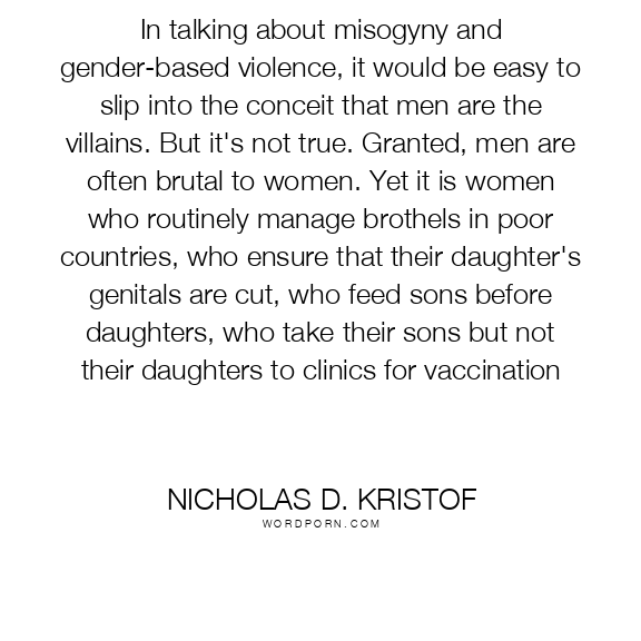 In talking about misogyny and gender-based violence, it would be easy to slip into the conceit that men are the villains. But it's not true. Granted, men are often brutal to women. Yet it is women who routinely manage brothels in poor countries, who ensure that their daughter's genitals are cut, who feed sons before daughters, who take their sons but not their daughters to clinics for vaccination