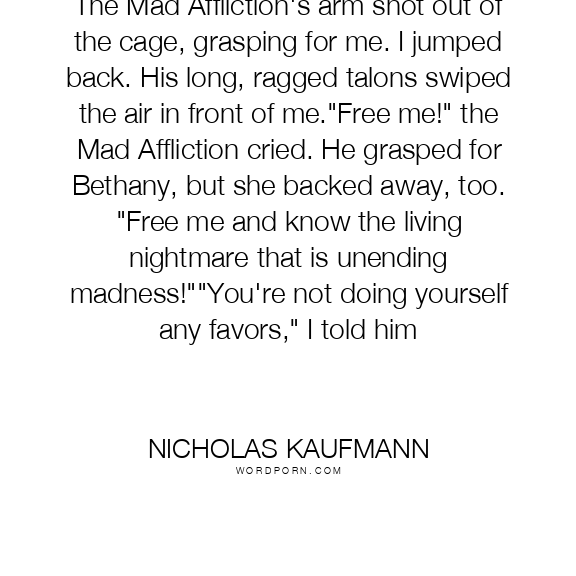 The Mad Affliction's arm shot out of the cage, grasping for me. I jumped back. His long, ragged talons swiped the air in front of me."Free me!" the Mad Affliction cried. He grasped for Bethany, but she backed away, too. "Free me and know the living nightmare that is unending madness!""You're not doing yourself any favors," I told him