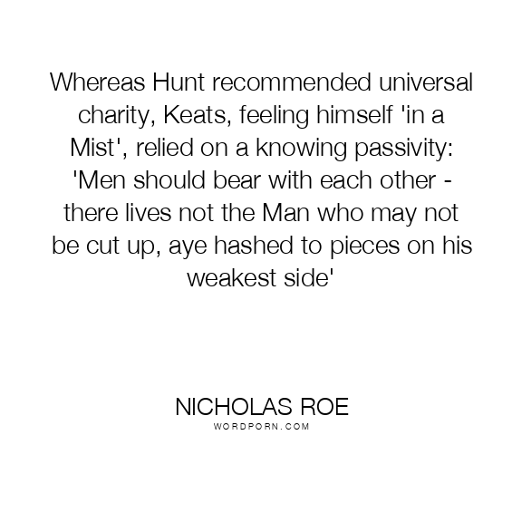 Whereas Hunt recommended universal charity, Keats, feeling himself 'in a Mist', relied on a knowing passivity: 'Men should bear with each other - there lives not the Man who may not be cut up, aye hashed to pieces on his weakest side'
