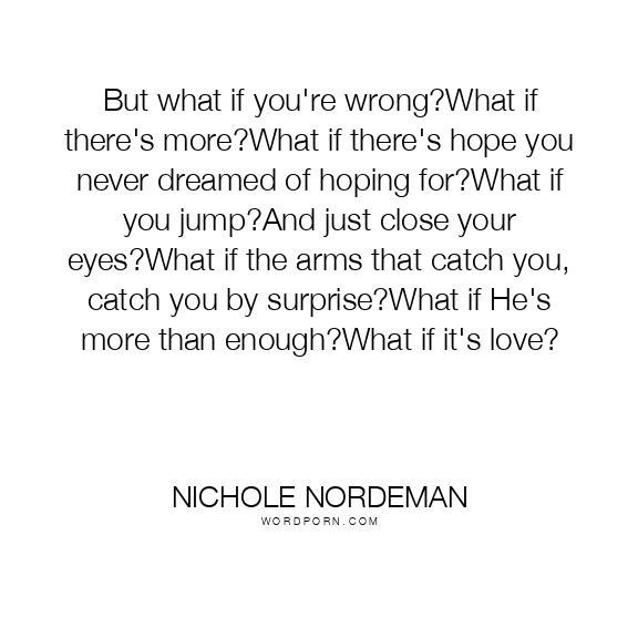 But what if you're wrong?What if there's more?What if there's hope you never dreamed of hoping for?What if you jump?And just close your eyes?What if the arms that catch you, catch you by surprise?What if He's more than enough?What if it's love?