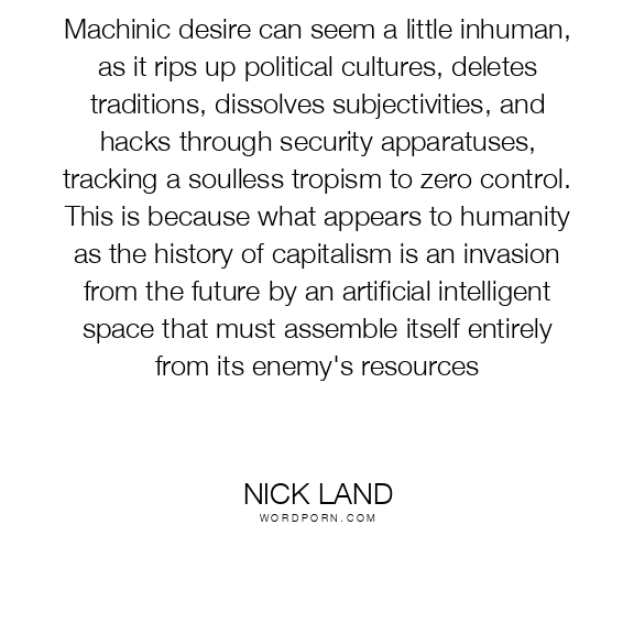 Machinic desire can seem a little inhuman, as it rips up political cultures, deletes traditions, dissolves subjectivities, and hacks through security apparatuses, tracking a soulless tropism to zero control. This is because what appears to humanity as the history of capitalism is an invasion from the future by an artificial intelligent space that must assemble itself entirely from its enemy's resources