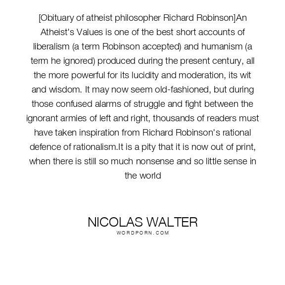 [Obituary of atheist philosopher Richard Robinson]An Atheist's Values is one of the best short accounts of liberalism (a term Robinson accepted) and humanism (a term he ignored) produced during the present century, all the more powerful for its lucidity and moderation, its wit and wisdom. It may now seem old-fashioned, but during those confused alarms of struggle and fight between the ignorant armies of left and right, thousands of readers must have taken inspiration from Richard Robinson's rational defence of rationalism.It is a pity that it is now out of print, when there is still so much nonsense and so little sense in the world