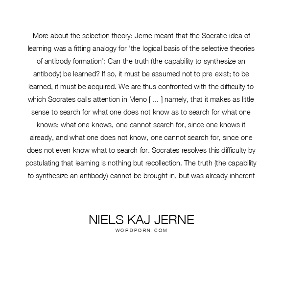 More about the selection theory: Jerne meant that the Socratic idea of learning was a fitting analogy for 'the logical basis of the selective theories of antibody formation': Can the truth (the capability to synthesize an antibody) be learned? If so, it must be assumed not to pre-exist; to be learned, it must be acquired. We are thus confronted with the difficulty to which Socrates calls attention in Meno [ ... ] namely, that it makes as little sense to search for what one does not know as to search for what one knows; what one knows, one cannot search for, since one knows it already, and what one does not know, one cannot search for, since one does not even know what to search for. Socrates resolves this difficulty by postulating that learning is nothing but recollection. The truth (the capability to synthesize an antibody) cannot be brought in, but was already inherent